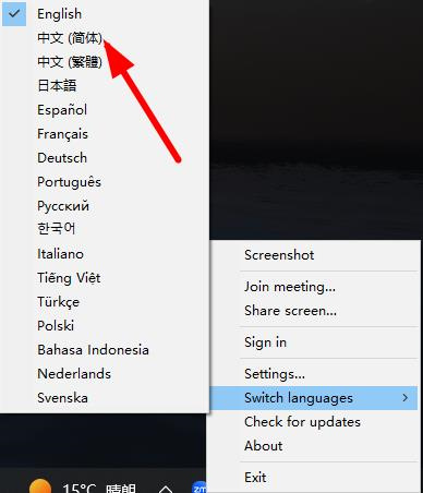 3、右键点击该Zoom图标,在弹出的菜单中将鼠标悬停在或选择“切换语言”选项。