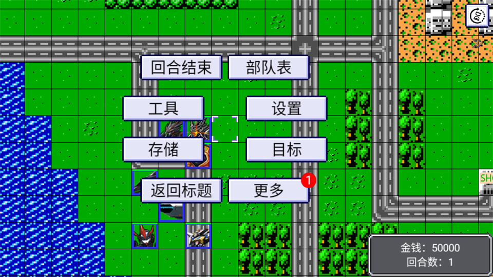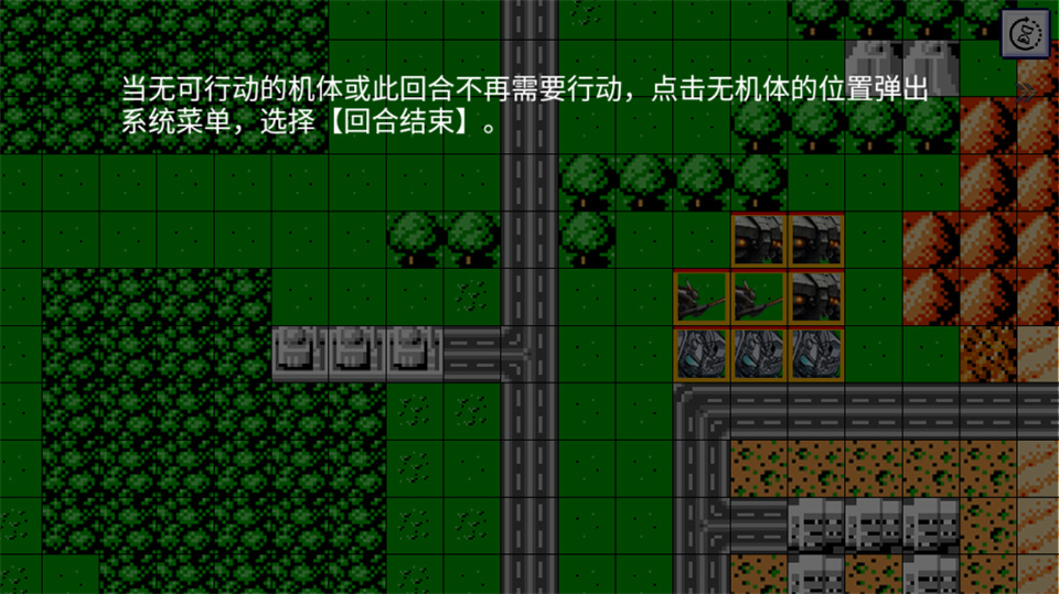 6、当无可行动的机体或此回合不再需要行动,点击无机体的位置弹出系统菜单,选择【回合结束】。
