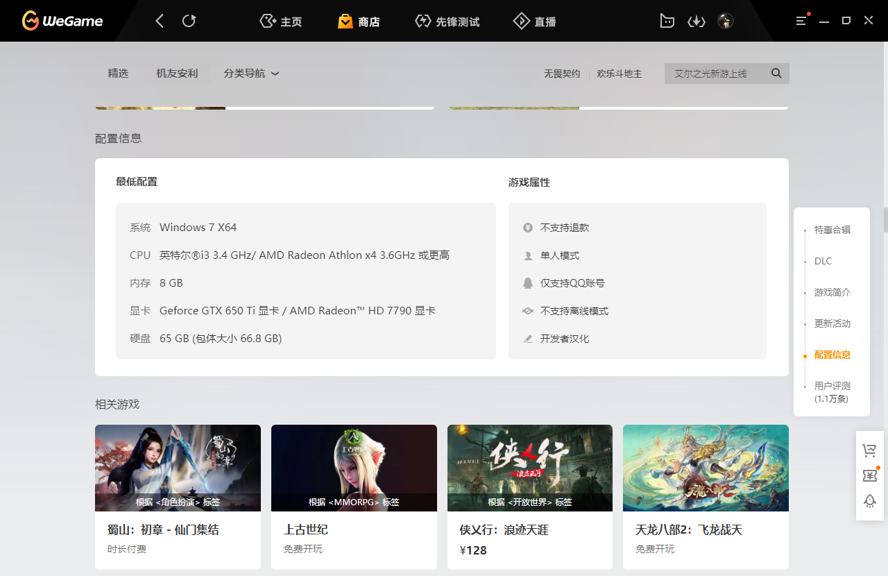 您可以在WeGame“商店”内打开该游戏详情页,在配置要求“一栏中即可检测。