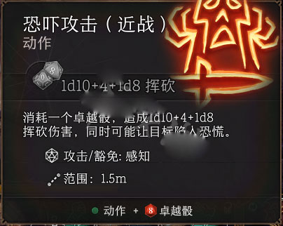 消耗一个卓越骰,攻击附加1d8和一回合的恐慌,遗憾的是由于当前版本限定4级DC最高只有13,这个DEBUFF很容易被豁免。战士主要是近战攻击的原因,很容易忘记远程也可以触发,必要时可以赌一箭触发恐惧,来救平时救不到的场。