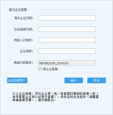 3、登录后即可进入“登记企业信息”界面,在此界面配置“海关企业代码”、“社会信用代码”、“纳税人识别号”和“企业名称”的信息,或者通过“企业信息导入”按钮,选择备份数据来导入企业信息。然后点击“确认”按钮,即可进入系统。登录所属期应与纳税所属期一致,格式:年+月(例:202007)。
