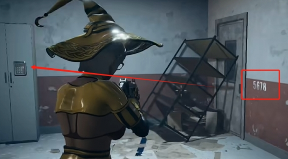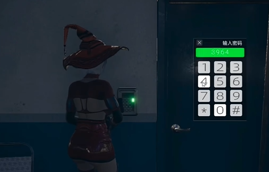 密码是3964,提示在墙上海报的同心圆图案的缺口位置。