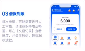 首次申请,可能需要进行人工审核,请注意保持电话畅通,可在【交易记录】查看进度,并关注短信,最快30秒放款。