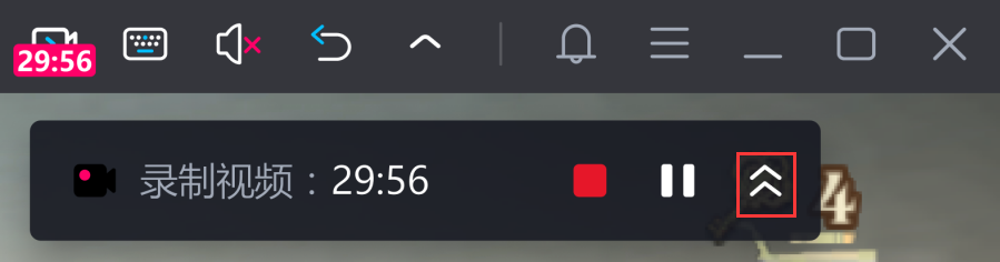 第二步,开始录制后,模拟器内的画面会录制下来,右上角将出现的录制中图标和录制状态浮窗,可以看到已录制时间,可暂停/继续录制。点击小箭头可向上收起到功能图标处,点击功能图标,可再次呼出录制状态浮窗。