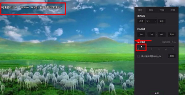 5、点击调节圆点向左拖动,最小值为0,向左拖动数值变小,也就是视频的播放速度就变慢了,在视频的画面也是可以按快捷键来调整,按ctrl+down就是减速,按R就会复原;