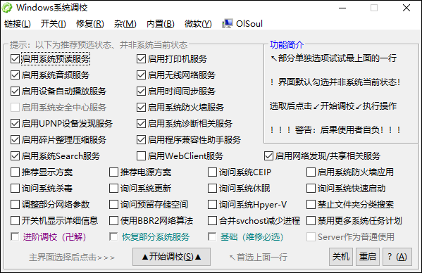 OlSoul的特色功能包括服务启动设置、开关调整(比如光驱自动播放、快速启动与休眠)、系统修复工具以及内置管理功能等。无论是优化系统性能还是解决常见问题,它都能轻松应对。特别是它的即开即用功能,降低了使用门槛,让用户无需复杂配置就能完成调校。