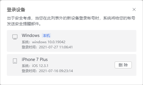 【个人中心-账号与安全-登录设备】显示当前账号登录过网易灵犀办公灵犀办公的所有设备,当账号在新设备登录网易灵犀办公时,系统会给账号发送新设备登录提醒邮件和短信。