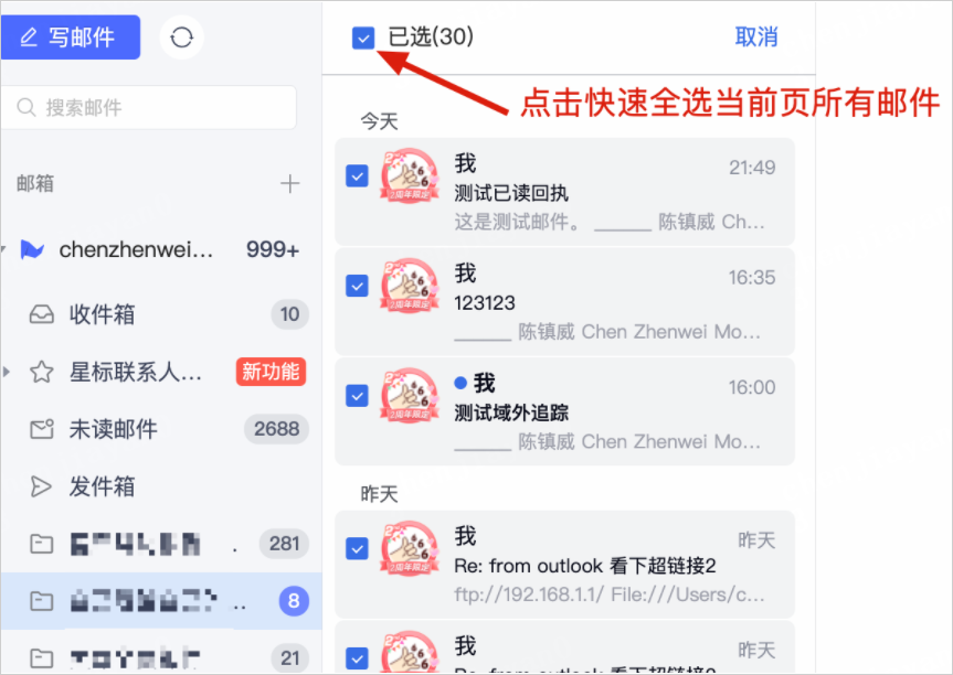 在邮件列表顶部外露【全选】按钮,点击可快速选中当前页的所有邮件,支持批量操作;