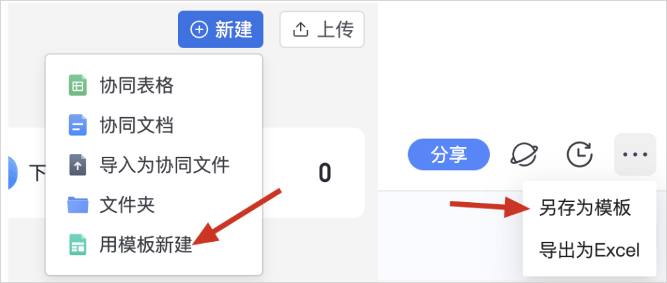 4、用模板新建:在【云文档-个人空间-新建】中支持使用模板快速新建。可以把自己常用的协同文档、协同表格保存为模板供以后使用。