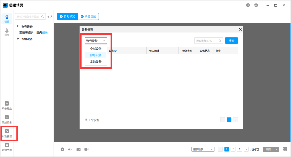 4、可以绑定管理多类型设备,点击设备管理,在下拉菜单中选择账号设备或本地设备,就能轻松管理。