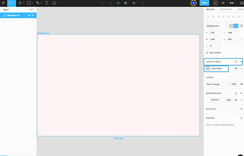 2、但是你也发现了,空白的界面并不适合设计,我们需要一些网格来帮我们辅助定位和分配空间。点击右边的加号,能够看到 LAYOUT GRID 下面的 Grid (10px) 会帮我们自动生成一个铺满当前白色页面的网格。