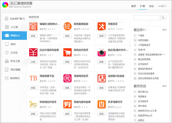 这两款浏览器都支持第三方的扩展支持,360安全浏览器会在安装时安装常用的几个浏览器插件,而360极速浏览器安装时不会添加第三方插件。如果需要使用第三方插件随时可以到扩展中心安装。