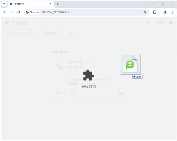 3、找到自己已经下载好的Chrome离线安装文件xxx.crx,然后将其从资源管理器中拖动到Chrome的扩展管理界面中,这时候用户会发现在扩展管理器的中央部分中会多出一个”拖动以安装“的插件按钮。