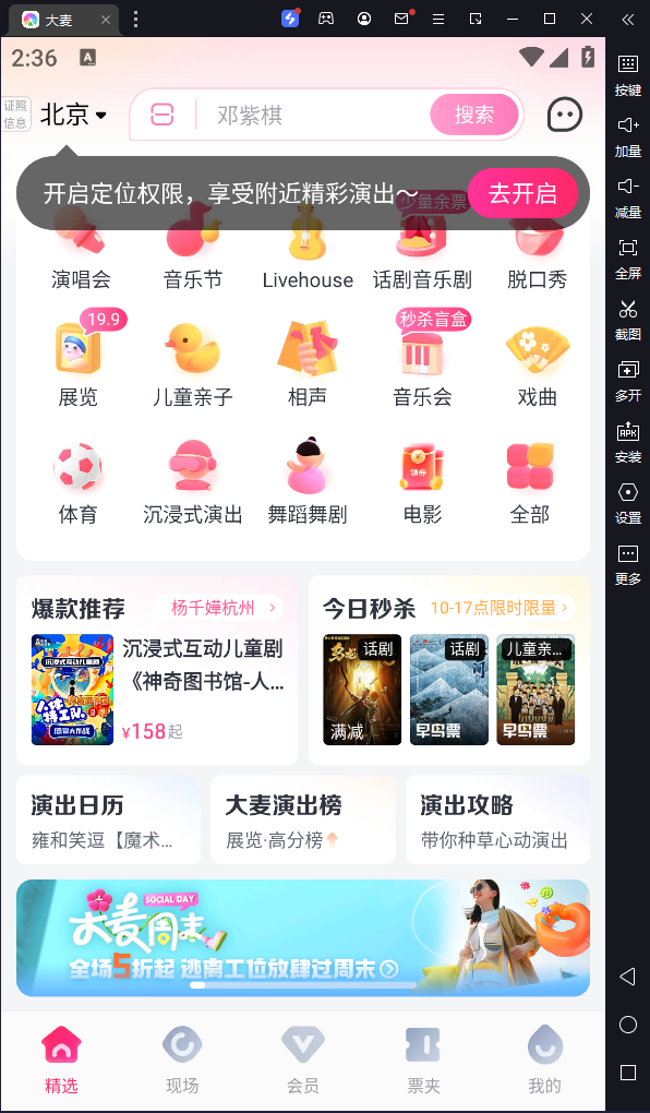 大麦网电脑版是一款通过安卓模拟器将手机客户端功能移植到电脑上的软件,界面简洁,功能齐全,操作起来非常方便。它集合了演唱会、话剧、音乐剧等各种演出信息,用户可以轻松浏览并完成购票和支付。相比手机端,电脑版的优势在于屏幕更大,能展示高清图片和详细介绍,让用户体验更直观。