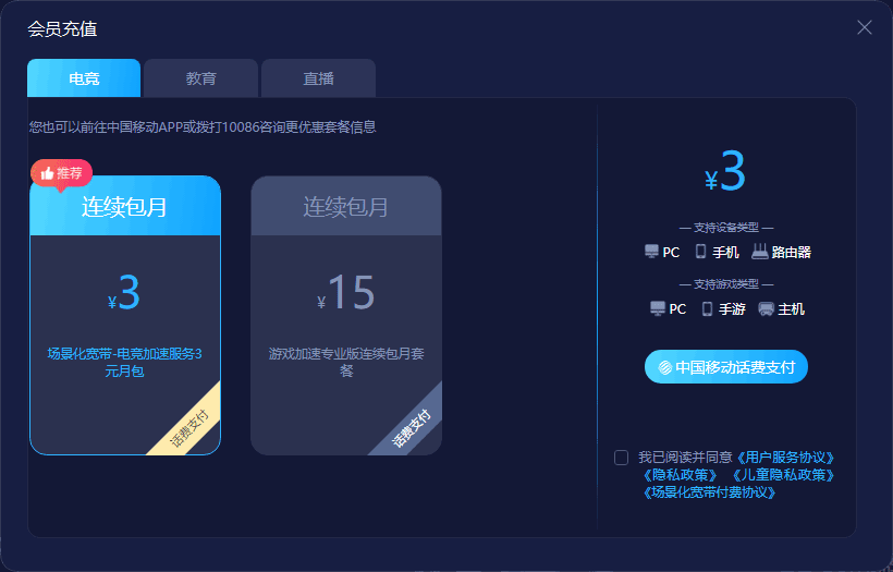 连续包月3-15元,支持pc、手游、主机,可以在中国移动话费进行支付