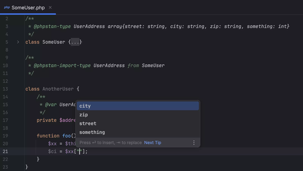 此版本改进了 PhpStorm 的 PHPStan 注解支持,引入了针对 @phpstan-type 和 @phpstan-import-type 中数组形状别名的代码补全。 使用在 PHPDoc 的 @phpstan-type 注解中定义(或在 @phpstan-import-type 注解中引用)的本地类型别名,IDE 会在类主体中自动补全数组键。
