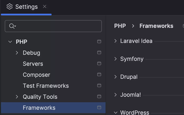 如果无法检测到路径,IDE 将打开 PHP | Frameworks(PHP | 框架)设置页面,以便您可以提供所需信息。