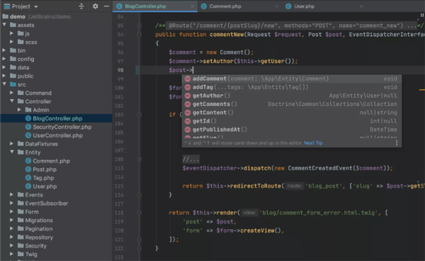 PhpStorm 可以帮助您在处理大型项目时提高编码效率,并节省时间。 只需点击一次或搜索用法,即可跳到方法、函数或变量定义。