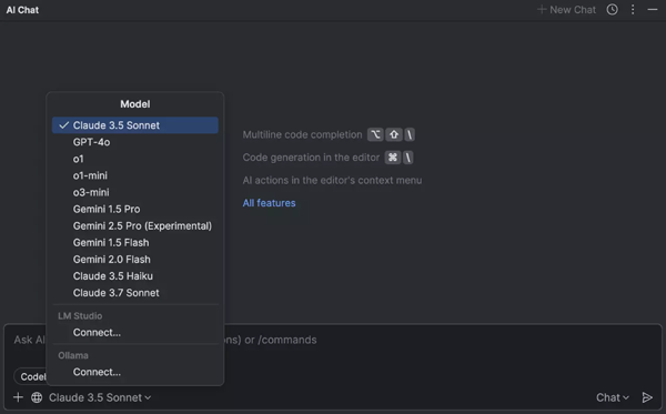 AI Assistant 让您可以灵活地离线使用本地模型,也可以利用基于云的 AI 处理。 借助新的离线模式,您现在可以在没有互联网连接的情况下工作,同时仍然受益于 AI 赋能的编码辅助。 通过 Ollama 或 LM Studio 将本地模型用于聊天、代码生成、提交消息、内联文档等。