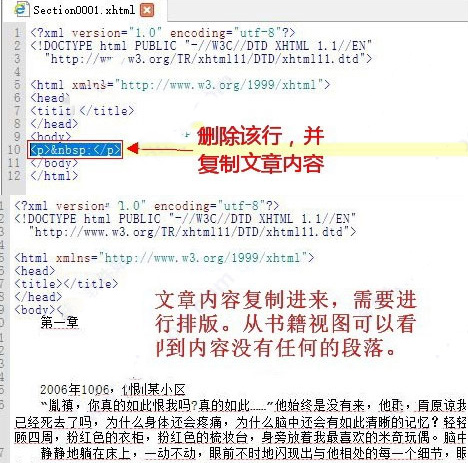 ②检查TXT的内容,是否有分章节,如果没有,那么自己添加章节。如果是数字开头的章节,改为第*章或者第*节。前后看看是否有序章、后记等。这是为后面进行分段做准备。
