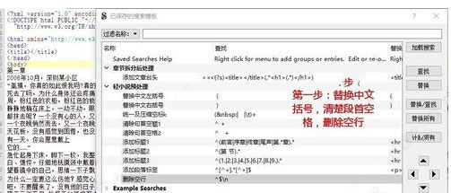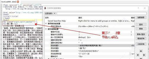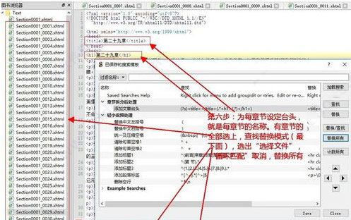 ⑦为章节设定名称。左手Test部分由章节的XHTML文件都选上,查找控制台的选项“循环匹配”取消勾选,模式中的点取“选择的文件”,然后点击右面替换所有。