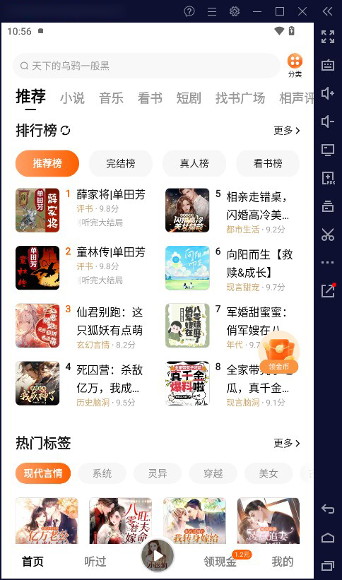 说到追小说,相信不少人都有这种经历:看着看着眼睛酸痛,这时候一款听书软件就派上用场了!最近我发现番茄畅听电脑版挺不错的,它是基于安卓模拟器运行的,功能还挺强大。里面啥类型的小说都有,像什么都市爽文、悬疑惊悚、言情穿越、玄幻修仙等等,分类特别详细,而且更新速度也很快,基本上想看的新书都能第一时间找到。