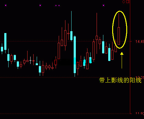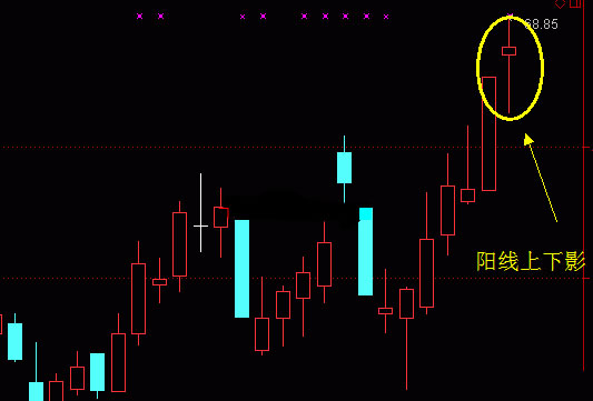带上影阳线:此形态表示多方受到空方打压,使股价上升受到阻力,表明多方力量不足。此形态如出现在强劲的上升之后,表示高位震荡,买盘不足,是下降的预兆;如出现在持续跌势之后,表示多方欲振乏力,行情可能继续下跌。
