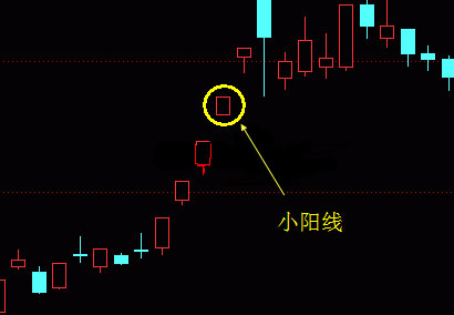 小阳线:不带上下影线的小阳线表示最低价即开盘价,收盘价为最高价,价位上下窄幅波动,显示多方力量逐步增强,多空双方中多方力量略占优势。此形态常出现在涨升初期、回调结束或盘整时。