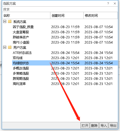 在新建选股页面,点击打开方案,打开如下界面: