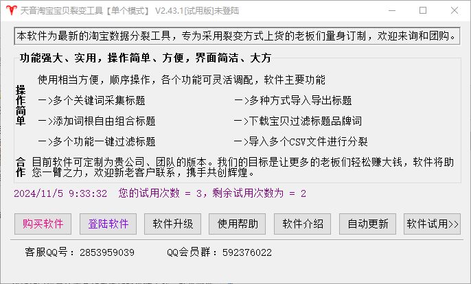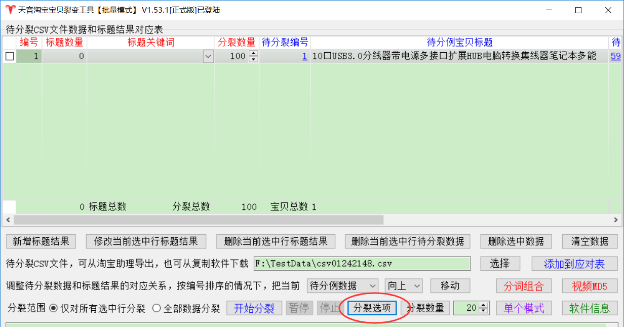 6、宝贝分裂:只需要提供带一条数据的CSV文件,即可将筛选下来的标题组合成裂变后的数据包;
