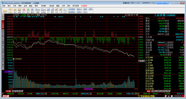当在系统设置中打开"分时图中成交量区间颜色显示"时,分时图中的成交量不再是单一的成交量颜色,而是有三种颜色:红色表示成交量是价格上涨过程中成交的;绿色表示成交量是价格下跌过程中成交的;白色表示是价格不变过程中成交的量。