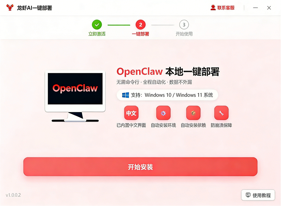 2、激活成功后,点击「开始安装」按钮,即可开始 OpenClaw 一键本地部署。