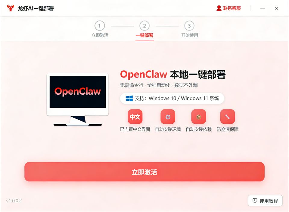 1、在本站安装好龙虾AI一键部署之后,双击桌面快捷方式打开,然后点击「立即激活 」按钮。