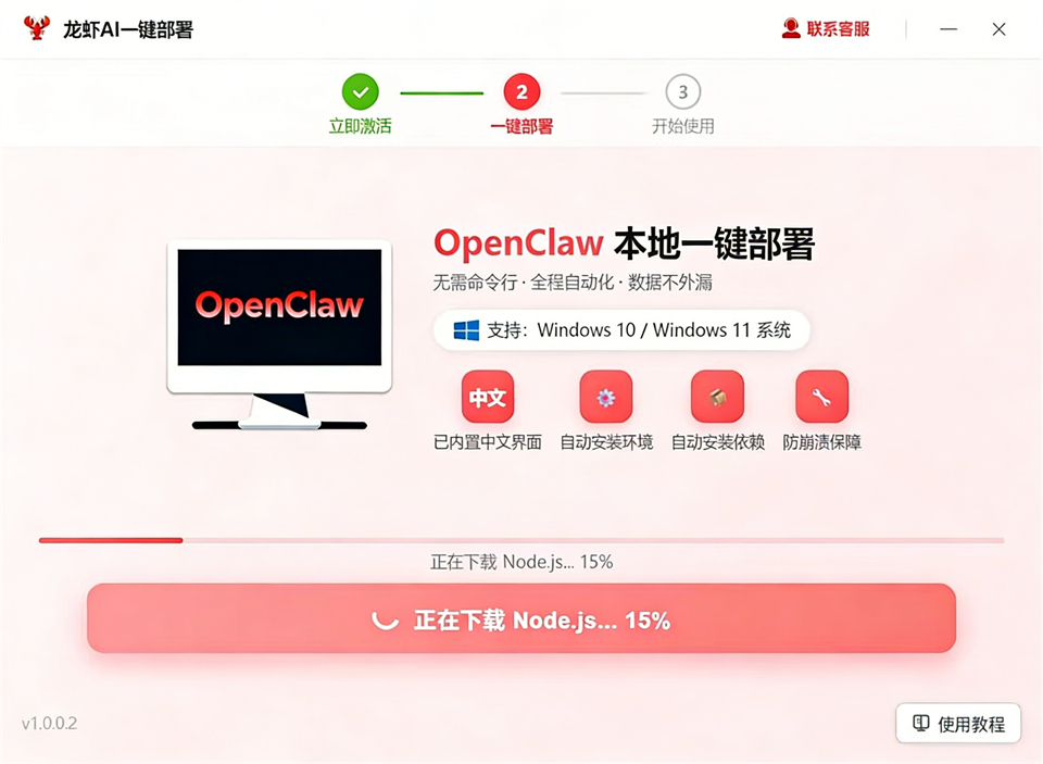 5、如果电脑之前没有安装过 Node.js,我们会为您自动下载并安装 Node.js(这是 OpenClaw 运行的必要环境)。