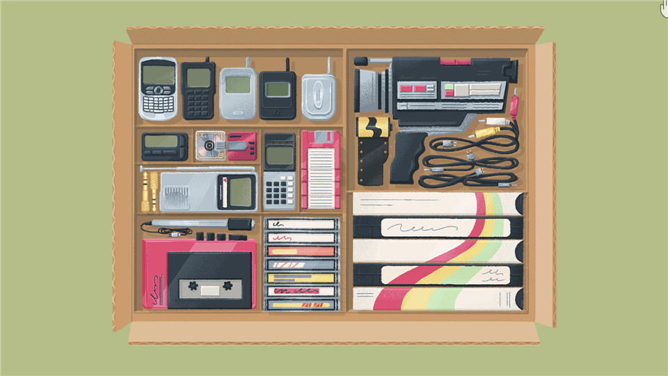 将物品摆放整齐,确保它们完美契合,务必使录像带上的标签对齐,手机按高度升序/降序排列,录像带上的标签按长度升序/降序排列。