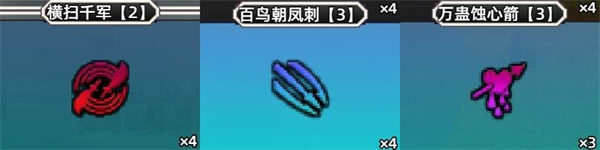 这里推荐横扫千军、百鸟朝凤刺和万蛊蚀心箭。横扫千军和百鸟朝凤刺都是消耗较低的强力技能,万蛊蚀心箭可以降低对方40%攻击力12秒,单挑强力技能。