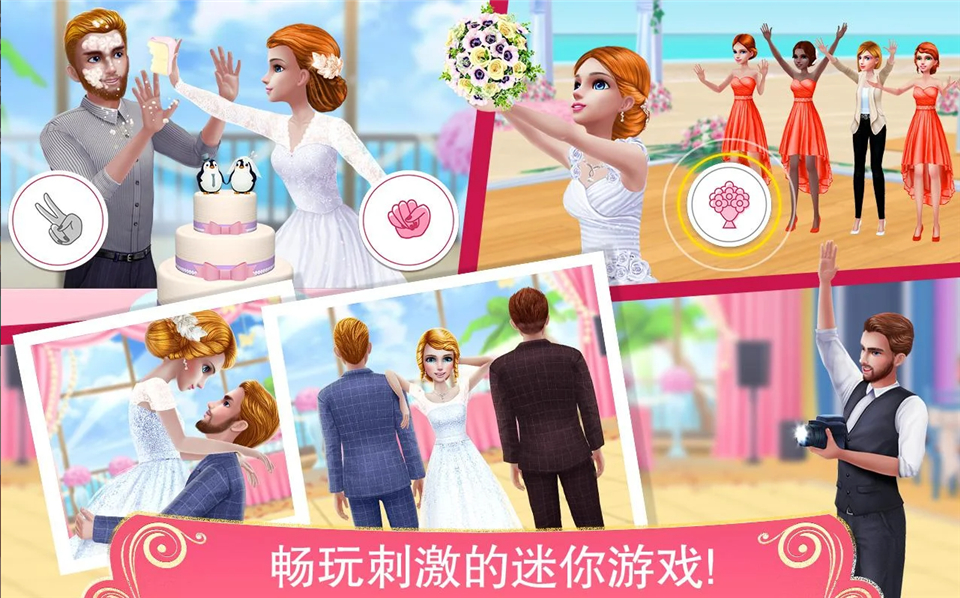 至于游戏特色,简直太多了!不仅要完成任务提升名望,还要挑选蛋糕、DJ和婚礼大厅。给新人做spa、设计派对服装、编排舞蹈、处理抛花束和蛋糕大战这些环节都超级有趣。尤其是互喂蛋糕时的混乱场面,总能让人忍俊不禁。