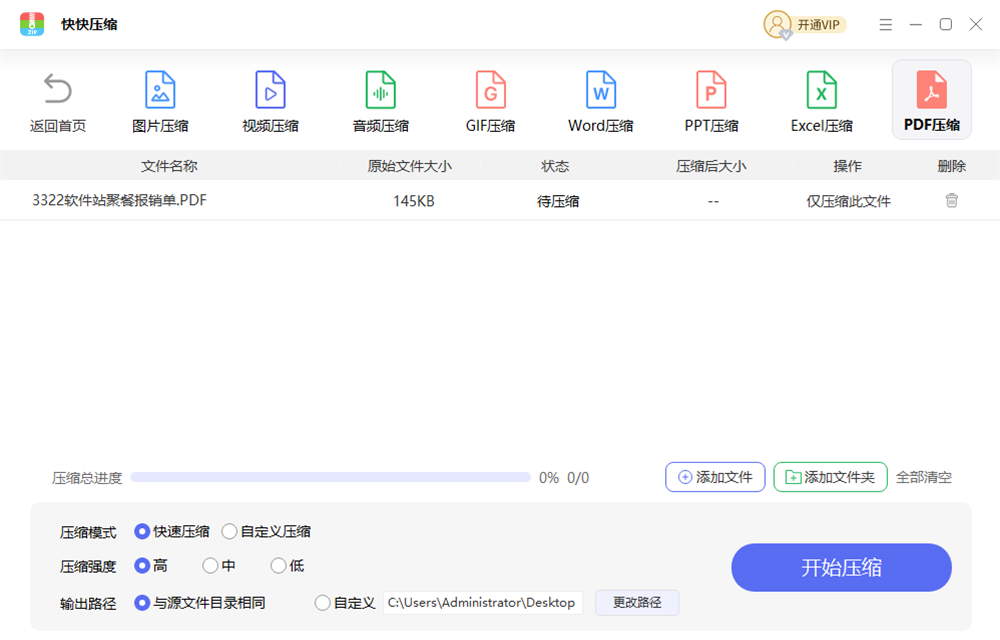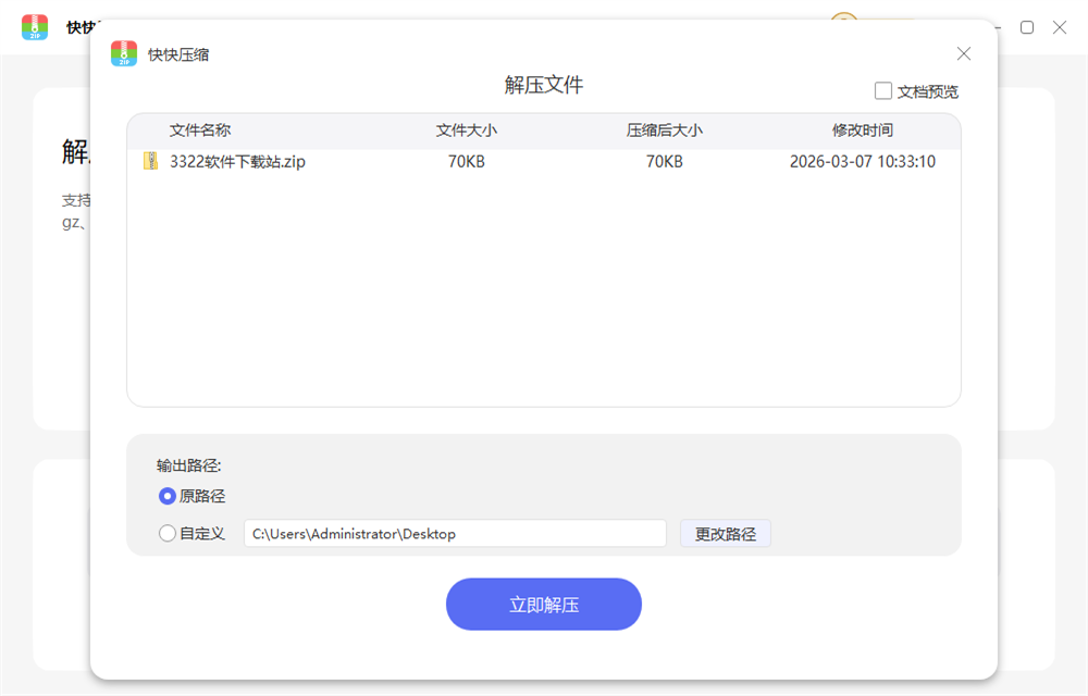快快压缩还特别注重用户体验,界面干净清爽,操作起来也顺手。比如我要解压一个大文件,它处理得很快,特别是用多线程优化这一点真的很实用。另外,针对图片、视频这些文件还有专门的压缩功能,方便极了!特别是像PDF、Word、PPT这种办公文件,处理起来特别方便。