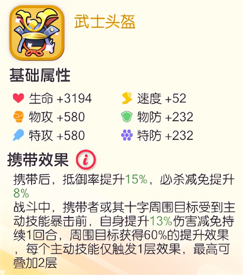 主要是增加抵御率,是一个偏向于保护队友的橙携。螺丝帽自身存活能力强,所以武士头盔的利用率会高一些。