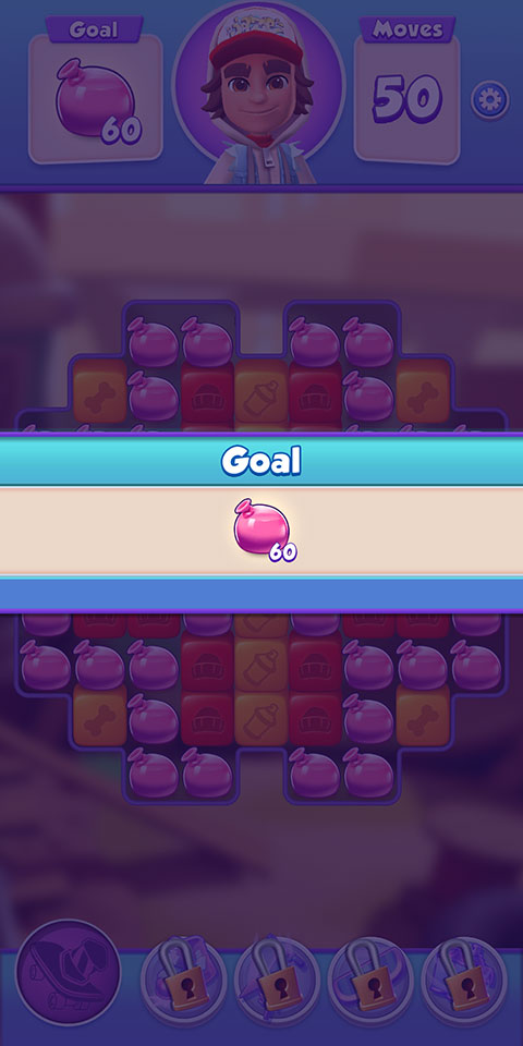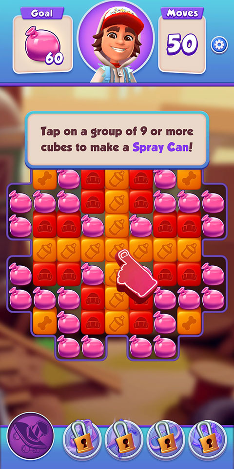 使用超强Subway Surfers充能,例如超级弹力鞋、跳跳棒、滑板和喷气背包,粉碎消除游戏关卡。