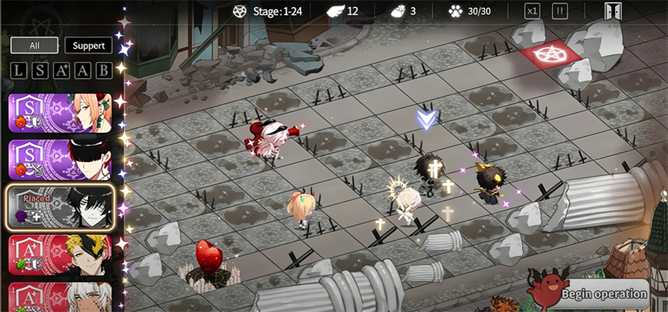 在战斗开始前,你需要选择角色加入战场,最多可以放置6名恶魔来对抗天使。(OS:战斗玩法像是升级版植物大战僵尸)