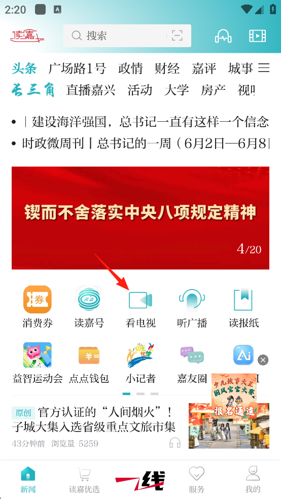 1、打开读嘉app,在首页找到看电视;