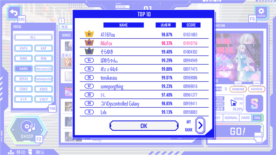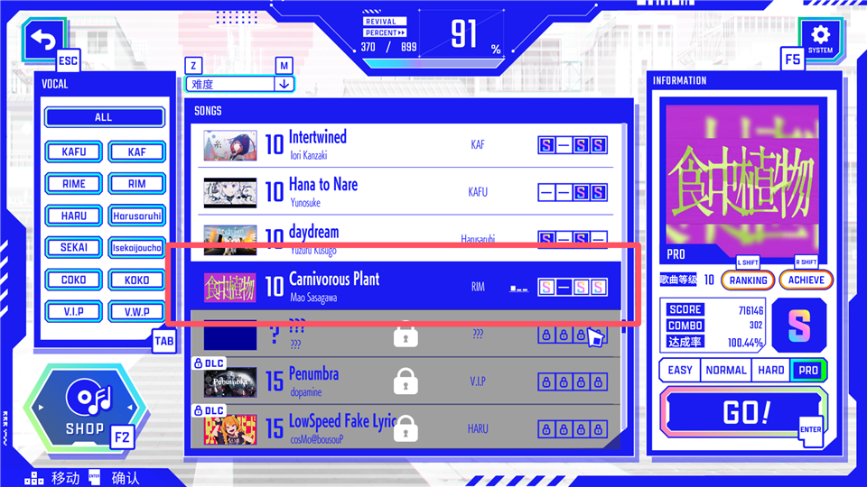 实际上这游戏的达成率上限不止100%,所以不需要ALL SUPER PERFECT。筛选PRO难度第一首歌,Carnivorous Plant,这首歌100%达成率的判定非常宽松,排行榜第一已经达到102.58%了。在做这个成就之前可以先完成满速打完一首歌的成就,获得的物品可以提高perfect的判定宽度(SUPER PERFECT不变)。