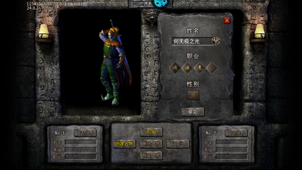 玩家本站下载并打开游戏之后,会进入到角色创建页面,玩家可以在战士、法师、道士三个角色内选择一个自己喜欢的角色进行创建。