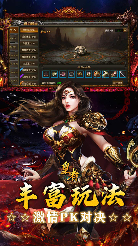 皇者是一款超火的传奇类手游, gameplay 丰富,玩家可以选择战士、法师或道士三大职业,体验刷怪打BOSS的乐趣。游戏画面精致,装备和时装特效酷炫,还能加入行会和其他玩家一起征战沙城。最方便的是它的挂机系统,自动战斗让玩家轻松升级。