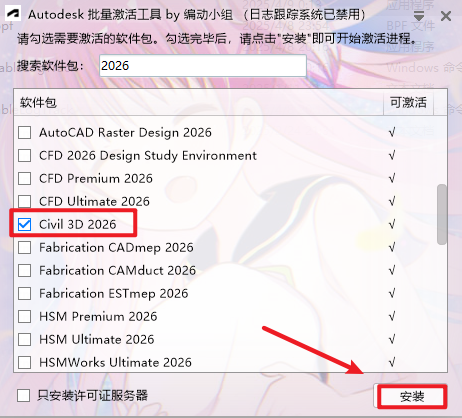 8、勾选【Civil 3D 2026】,点击【安装】。