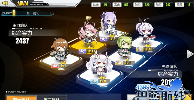 在编队界面可以看到舰队的详细数值, 这里的编队数值是全队总览,但是伤害计算时依然是按各个舰娘分开计算。
