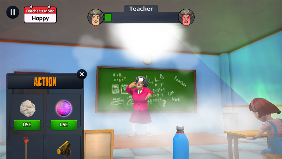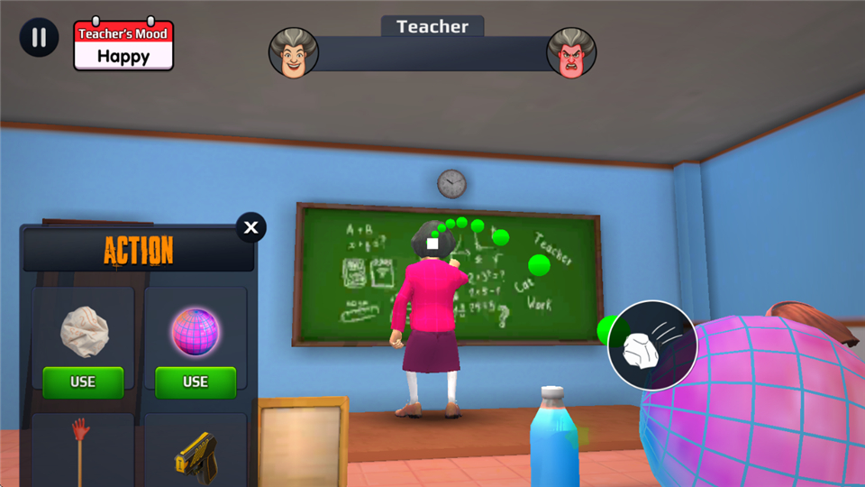 打老师的玩法挺有趣的,左下角是道具栏,选择一个道具瞄准老师扔过去,老师会有不同的反应。比如扔动感光波球,她就会跳舞。这种互动设计很有趣,让人忍不住想试试各种道具的效果。