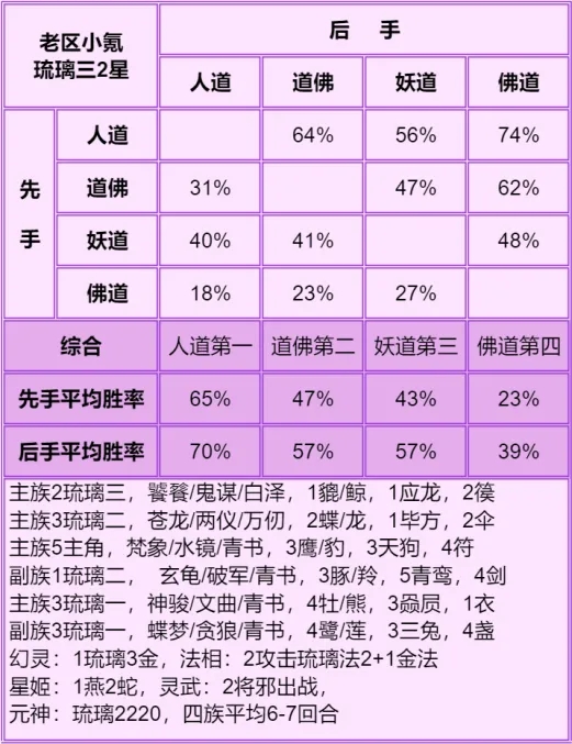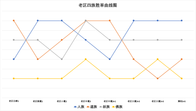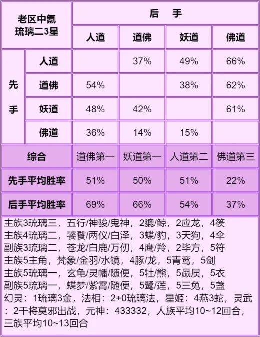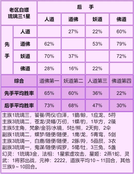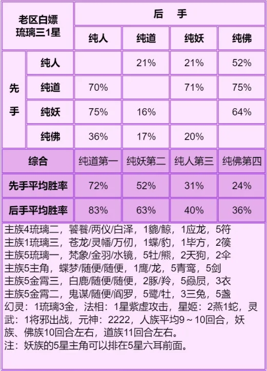 神仙局5~6回合打完为道族强时期,这个时间点人族开始无力,妖族开始发力,回合再短点打不过人,再长点打不过妖。老区白嫖纯道例外,道族优势太大了,这个回合能再宽松一些。