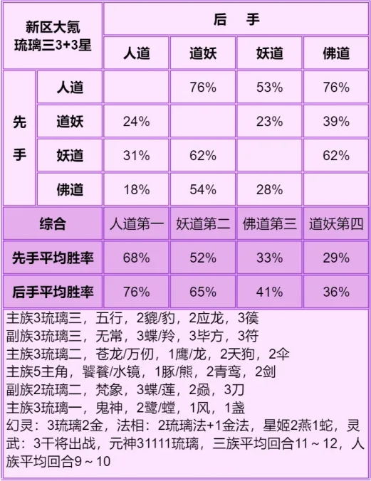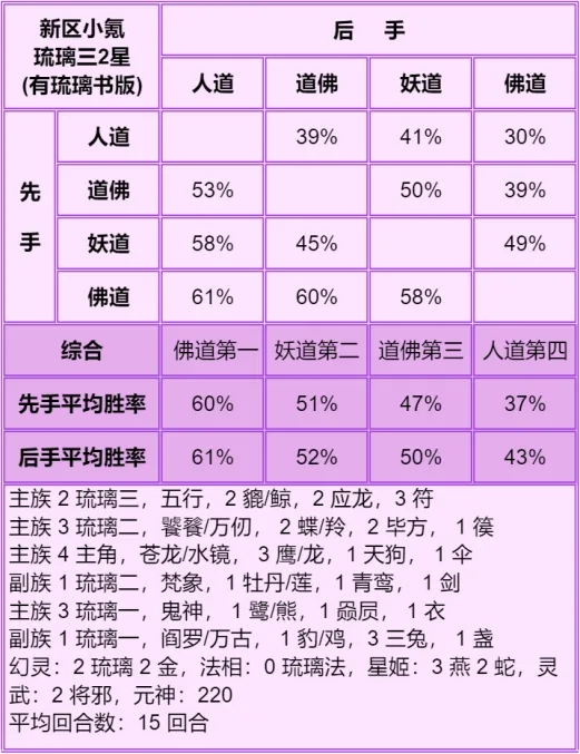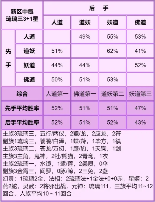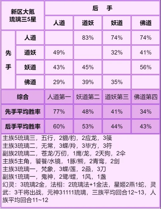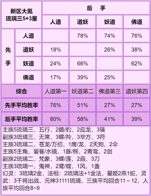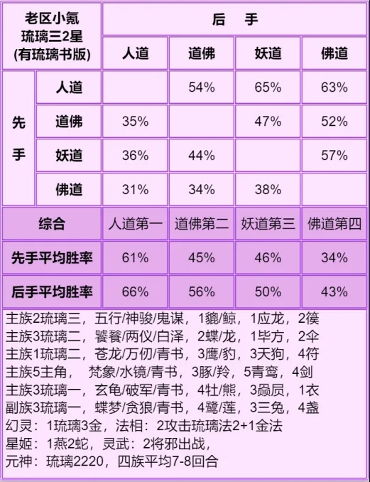 ◆ 胜率表从左往右看,横排的先手打竖排的后手,写的是先手胜率,每个胜率均切磋了100场,胜率表中差距低于5%的可视作没区别,正常胜率浮动都不止5%。